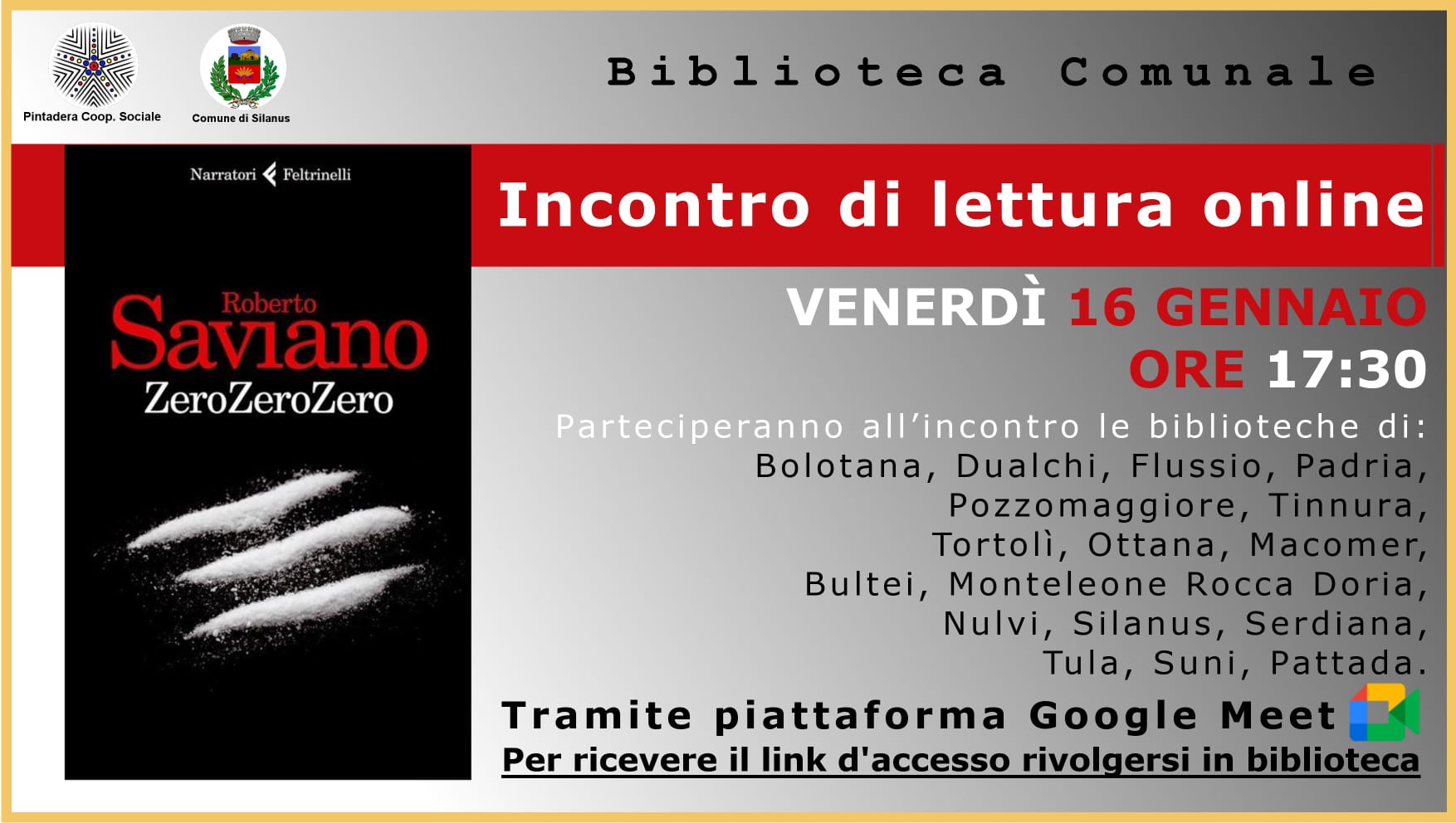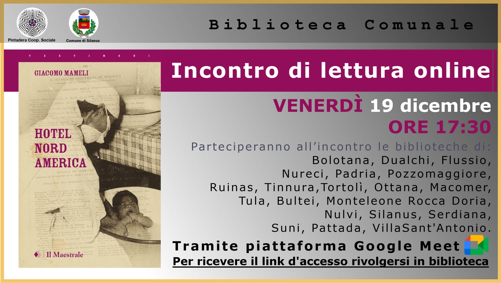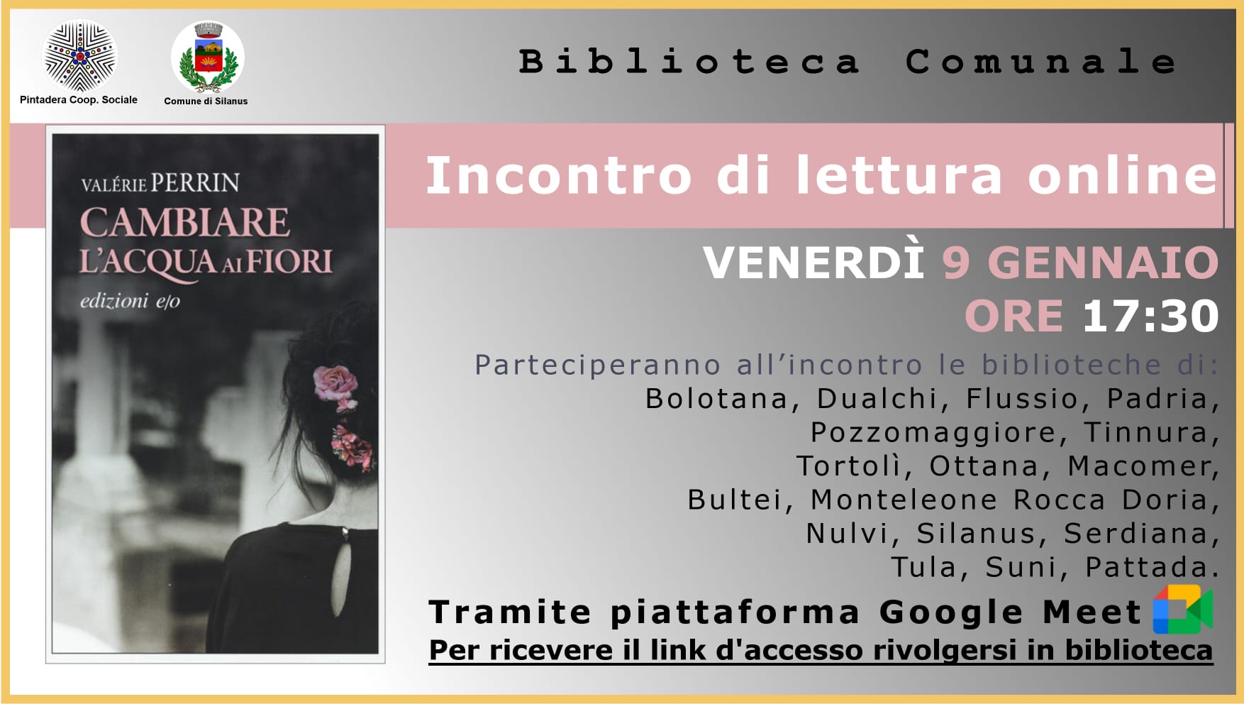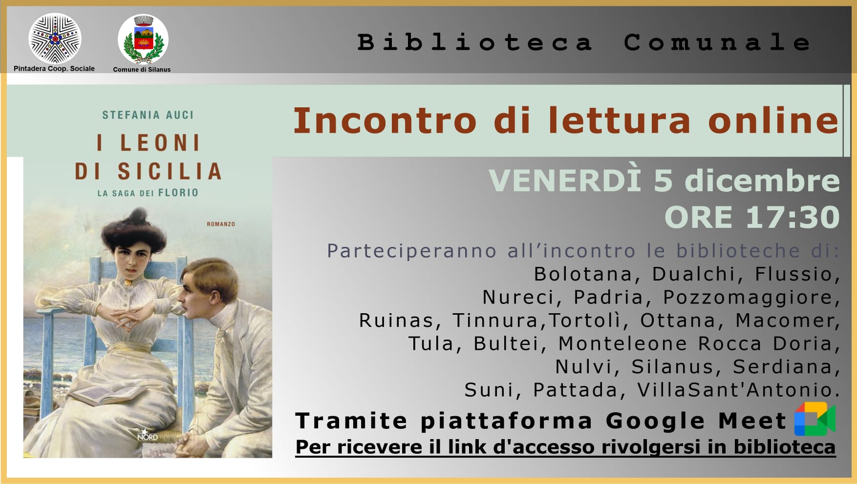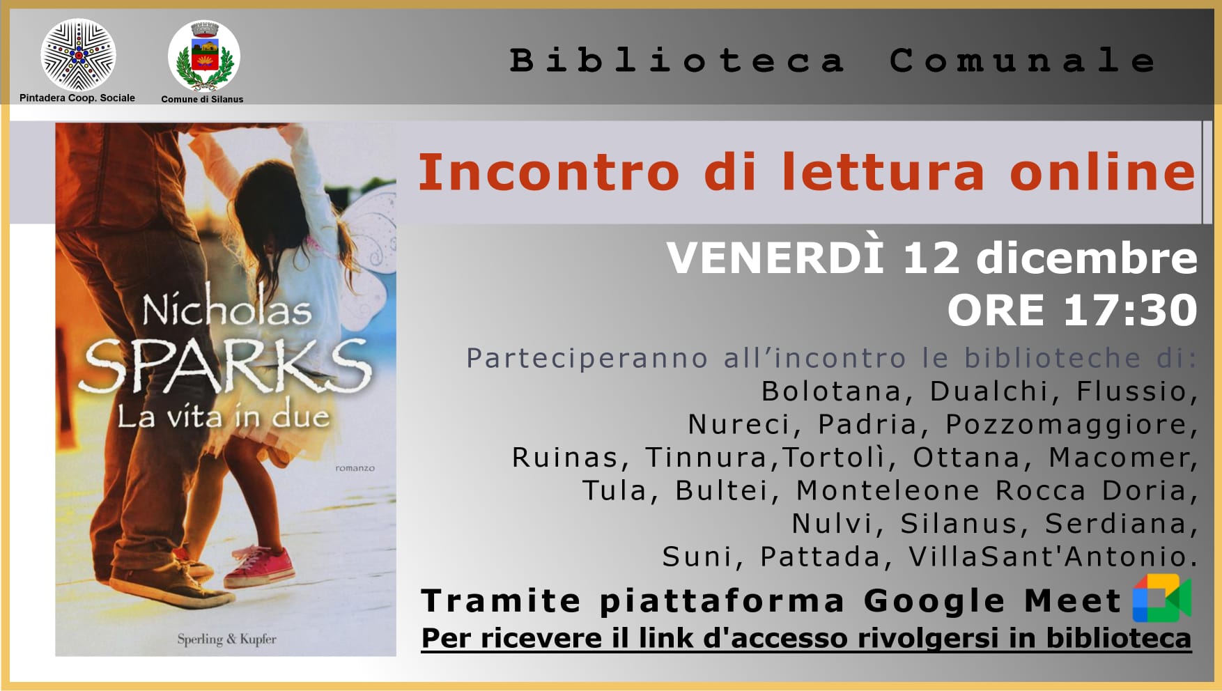 Per partecipare occorre semplicemente collegarsi alla Piattaforma Google Meet per condividere con altri appassionati di libri un momento di lettura dedicato, di volta in volta, a un libro diverso.