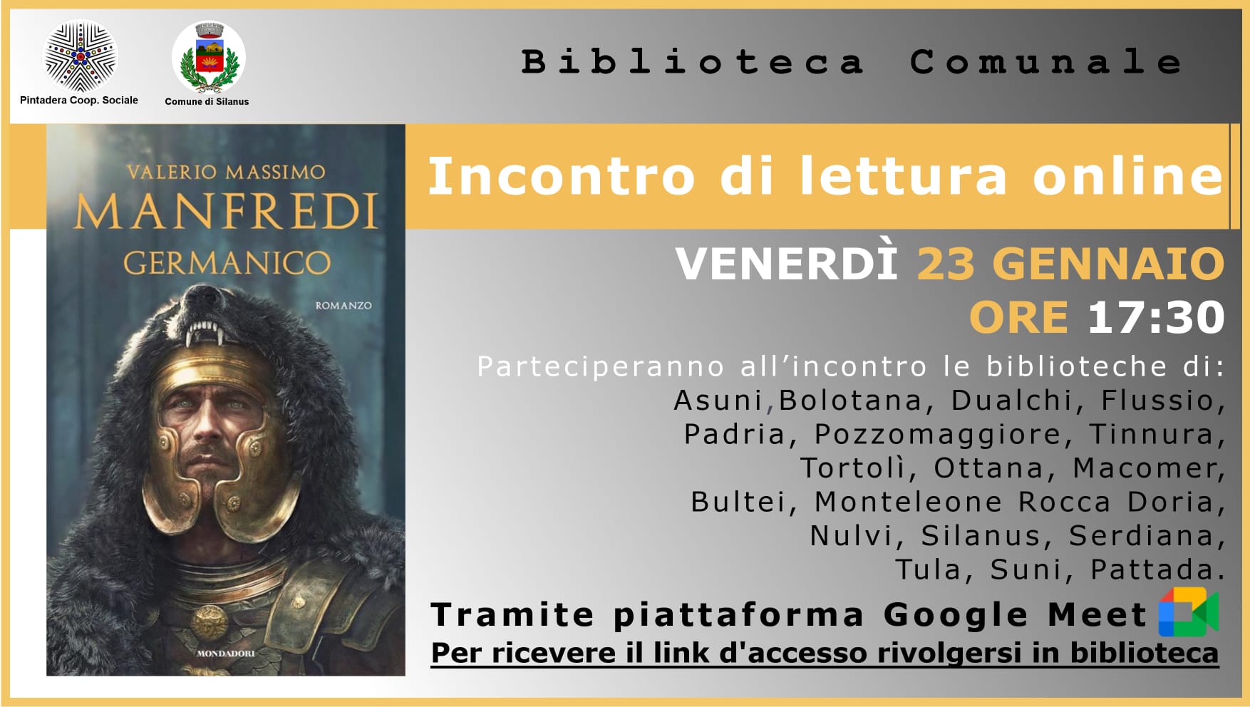 Il prossimo incontro è fissato per venerdì 23 gennaio alle ore 17:30 e l’opera in oggetto sarà “Germanico” di Valerio Massimo Manfredi.