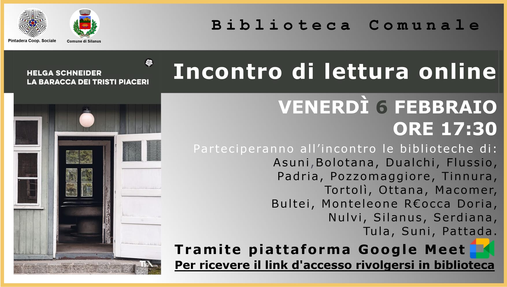 La Cooperativa Pintadera, che gestisce il servizio bibliotecario comunale organizza degli incontri di lettura pubblica online, con il coinvolgimento di altre biblioteche della Sardegna.