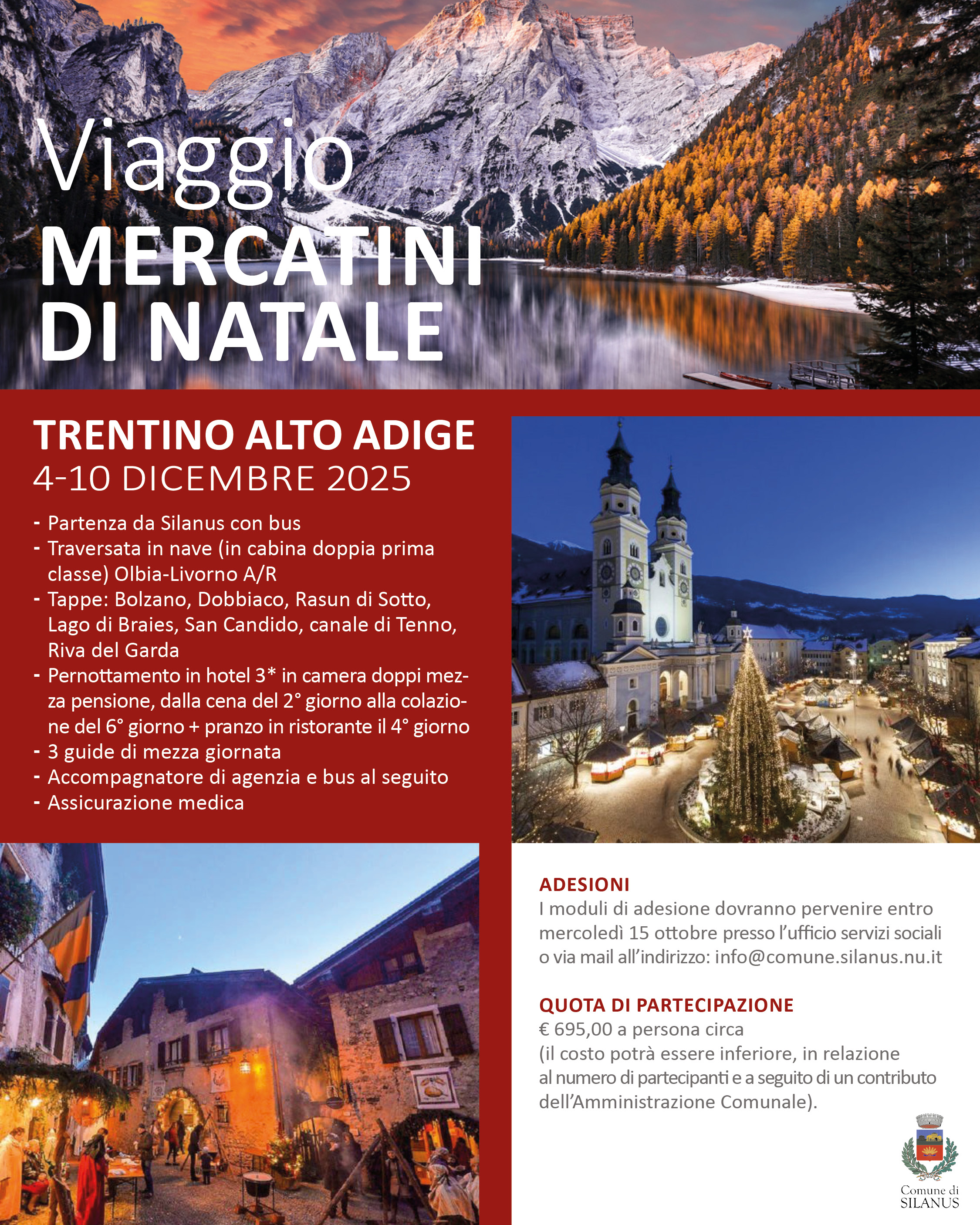 L’Amministrazione Comunale, al fine di creare momenti di socializzazione e scambio culturale, organizza un viaggio in Trentino Alto Adige aperto a tutta la popolazione.